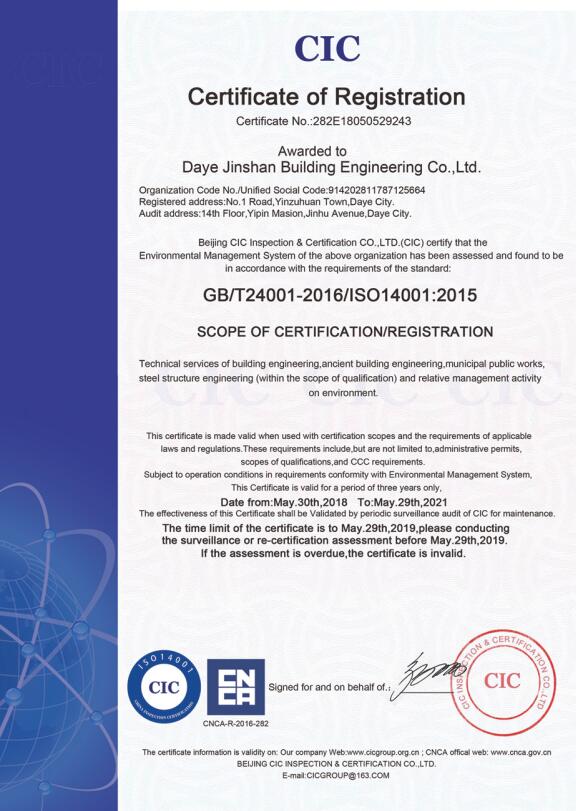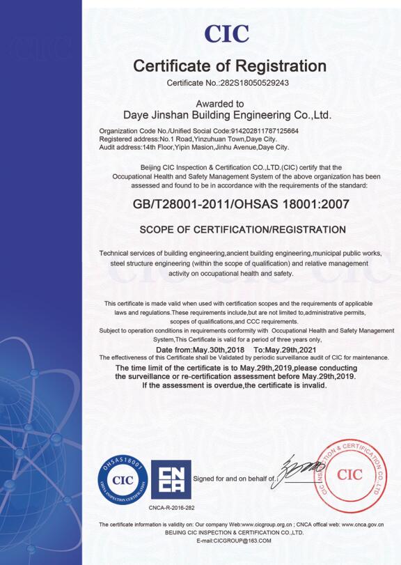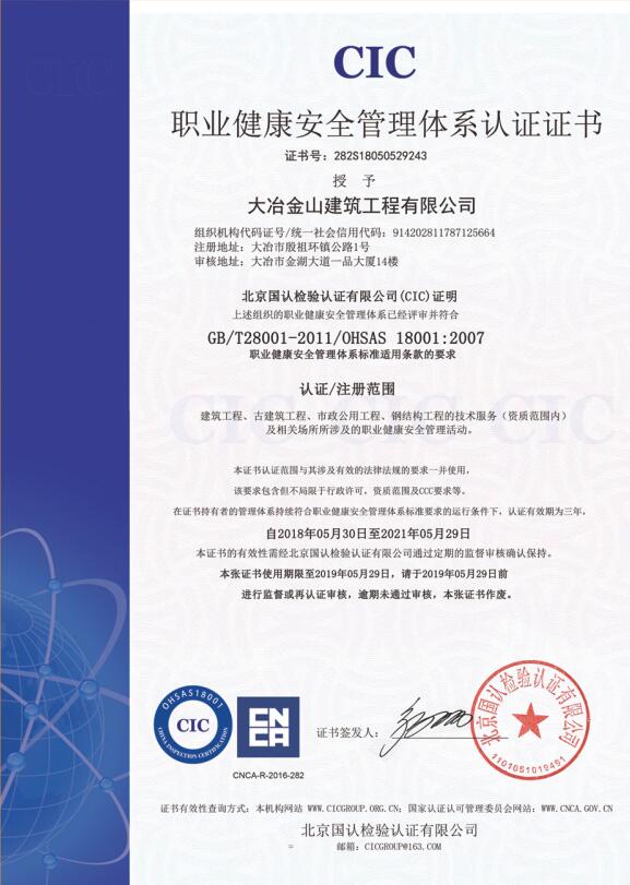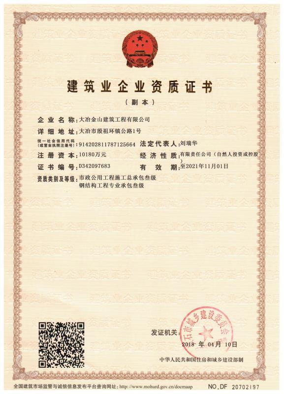 大冶金山建筑工程有限公司始建于1984年,屬鎮(zhèn)辦集體企業(yè)。1997年改制為大冶山建筑工程有限責任公司,屬股份制企業(yè)。2013年更名為大冶金山建筑工程有限公司,2018年3月公司資源重組,公司注冊資金達到10180.00萬元,公司法定代表人為劉瑞華。公司具有古建筑工程專業(yè)承包壹級、建筑工程施工總承包貳級、市政工程總承包叁級、鋼結(jié)構(gòu)工程專業(yè)承包叁級資質(zhì)。